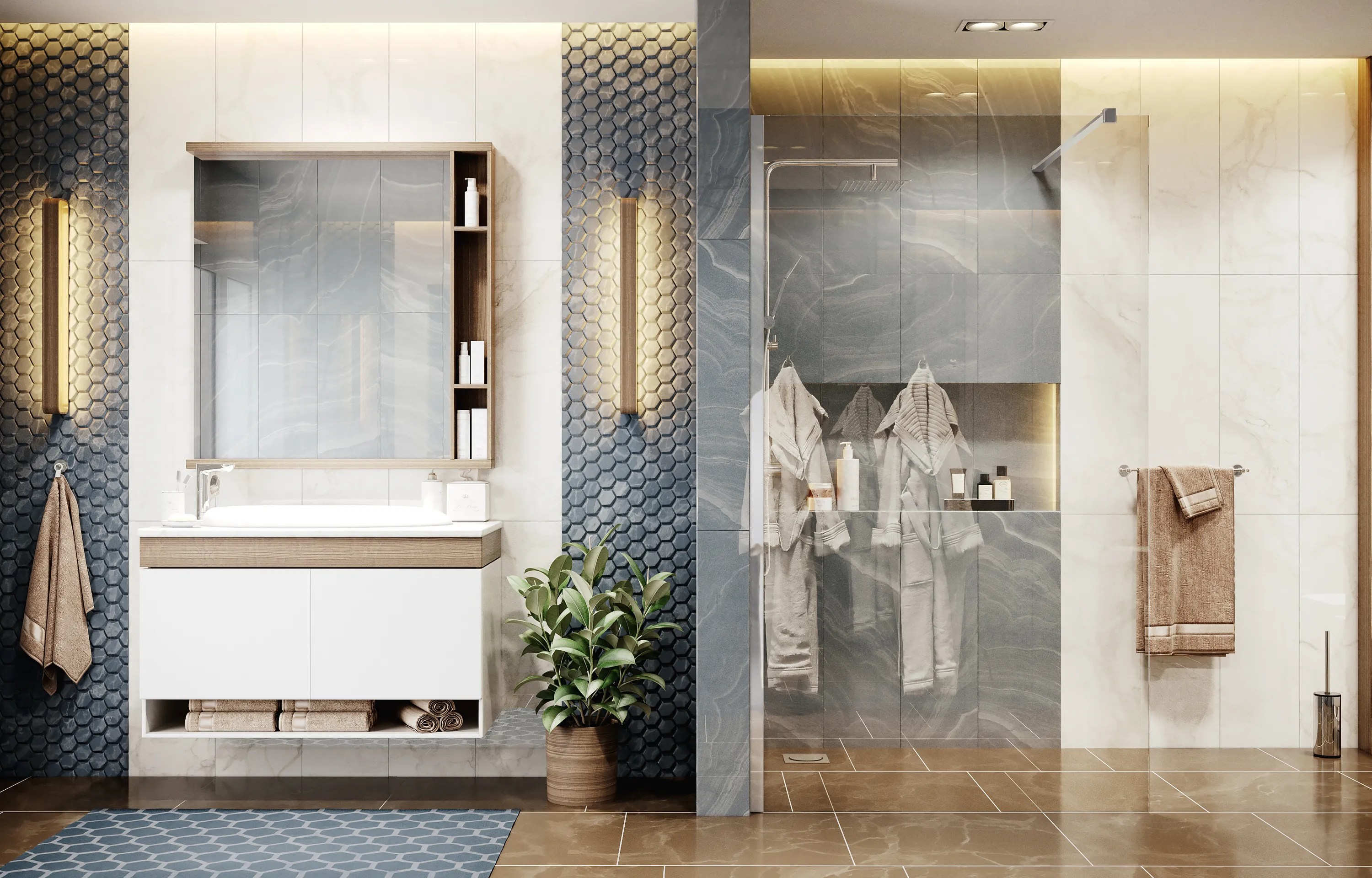 Благодаря максимальному комфорту при приеме душа перегородки со свободным входом невероятно популярны в странах центральной Европы и США. Рекомендуем монтировать ограждения непосредственно на пол и выдвигать на передний план интерьер керамической плитки.