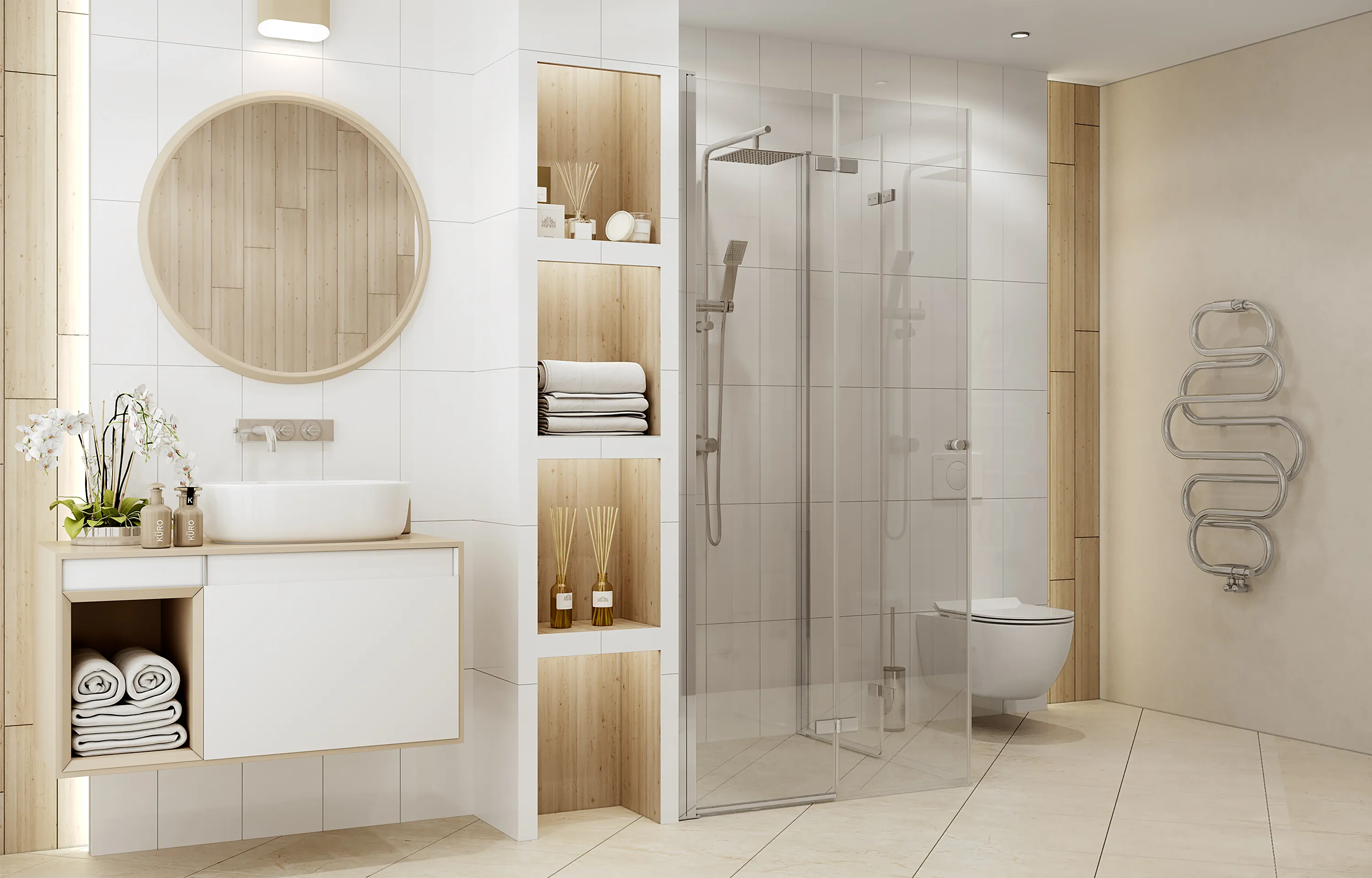 Распашные двери с цилиндрическим механизмом обеспечивают плотное прилегание всех компонентов ограждения. После принятия душа вода, как правило, стекает вовнутрь душевого пространства и кафель остается сухим, что исключает возможность поскользнуться, а также необходимость производить последующую уборку ванной комнаты.